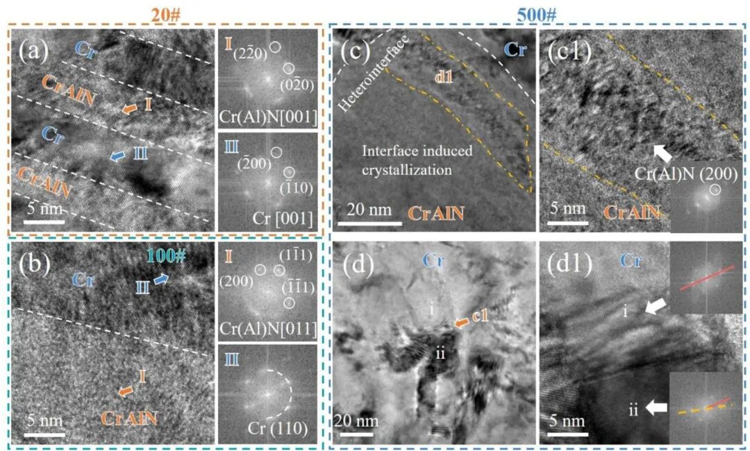 图7. 压缩后的微观结构演变:(a)和(b)压缩后20#和100#的高分辨TEM图像;(c)和(c1)500#中异质界面附近CrAlN的高分辨TEM图像;(d)和(d1)500#中Cr的高分辨TEM图像。插图为对应的FFT图像。