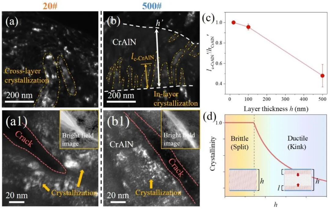图8. (a)和(a1)压缩后20#样品的暗场TEM图像;(b)和(b1)压缩后500#样品的暗场TEM图像。插图为(a1)和(b1)对应的明场TEM图像;(c)c-CrAlN晶粒高度与变形后CrAlN层厚度的统计比例;(d)CrAlN结晶度与层厚度关系的示意图。