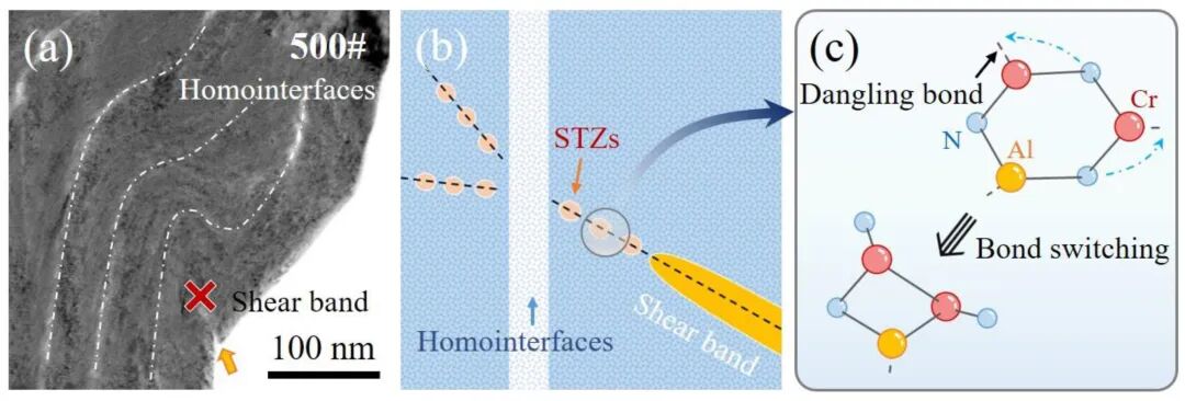 图9. (a)压缩后500#样品中剪切带的STEM图像;(b)剪切带与同质界面相互作用的示意图;(c)变形过程中a-CrAlN内原子运动的示意图。