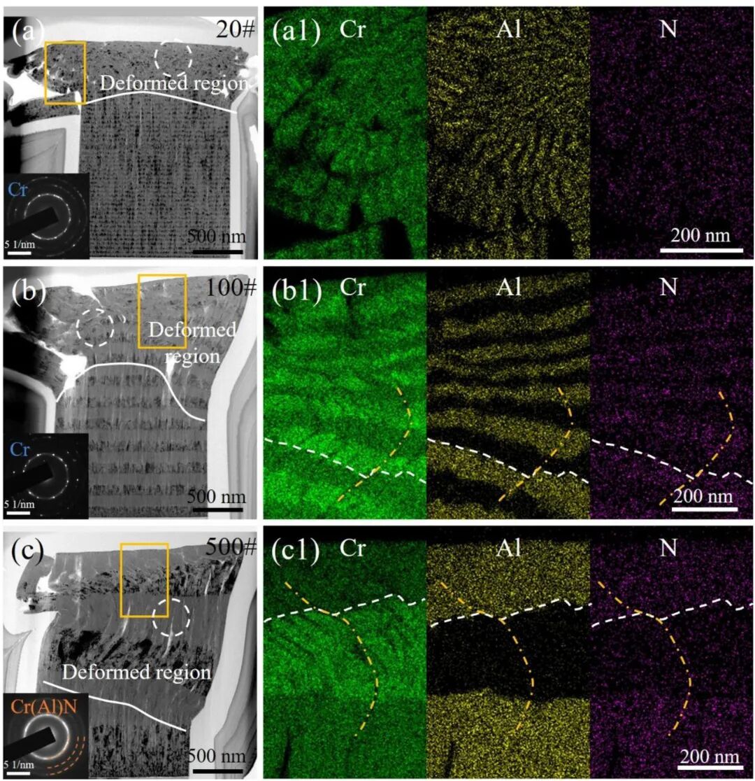 图6. (a-c)20#至500#压缩后微柱的TEM图像,明显变形区域用实线标出。插图为虚线圆圈对应的选区电子衍射图;(a1-c1)TEM图像中局部区域(橙色框标记)的EDX元素分布图,其中同质界面和异质界面分别用点划线和虚线标出。