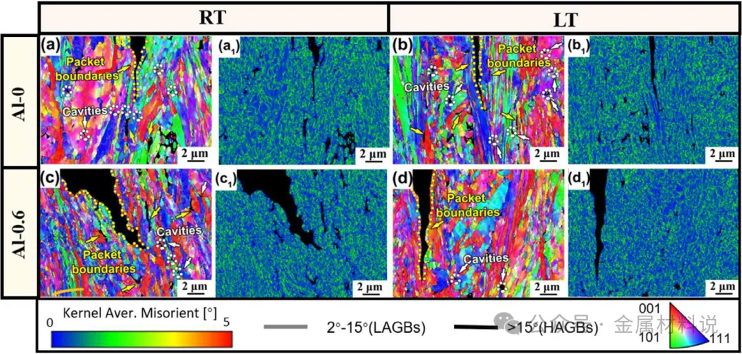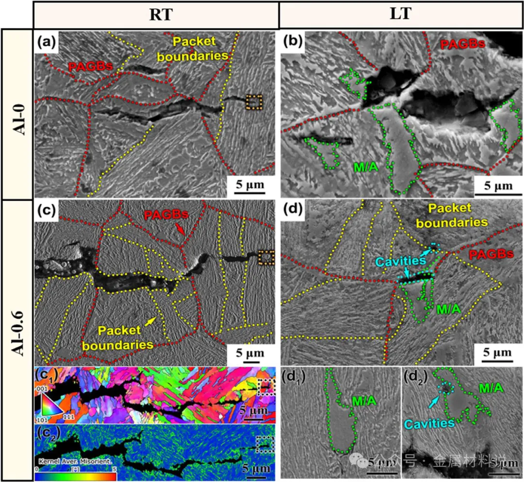 01 图9展示不同铝含量贝氏体钢在室温与低温条件下的慢应变速率拉伸行为及氢脆指数变化。充氢显著降低抗拉强度与总伸长率,而随铝含量升高,强度逐渐下降但延性提高。氢脆指数随铝含量增加而降低,其中Al-0.6在室温下抗氢脆能力提高约24%,低温下仅提升约2%。 02 图10揭示不同条件下断口形貌演变规律。未充氢样品以韧窝与微孔聚合为主,表现典型韧性断裂;充氢后颈缩消失、韧窝尺寸减小,并出现准解理与沿晶断裂特征。低温条件下断口更加平直,脆性特征进一步增强。 03 图11通过EBSD分析充氢条件下裂纹扩展路径及KAM分布。裂纹主要沿板条包界面扩展,并伴随大量空洞形成与短裂纹连接。Al-0.6由于晶粒细化导致裂纹路径更加曲折,需要更高扩展能量,从而提升抗裂纹扩展能力;低温下裂纹趋于直线传播。 04 图12表征充氢后残余奥氏体向马氏体转变行为。氢致晶格畸变促进马氏体形成,而马氏体具有更高氢扩散速率与更低氢溶解度,导致局部氢富集并加剧氢致解理开裂。提高残余奥氏体稳定性可有效抑制该过程。 05 图13展示充氢试样纵截面裂纹传播模式差异。Al-0中裂纹沿原始奥氏体晶界扩展,表现沿晶脆断;Al-0.6则转为穿晶扩展且路径弯曲,这是晶粒细化、位错减少与残余奥氏体稳定化协同作用的结果,但低温下残余奥氏体失稳使该优势显著削弱。