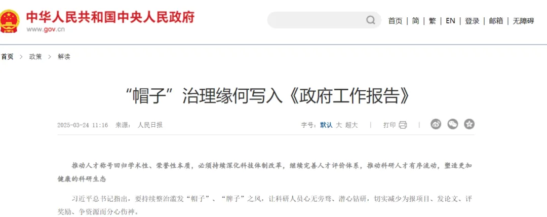 2020年,中华人民共和国科学技术部等多部门发布《关于破除科技评价中“唯论文”不良导向的若干措施》,其中就明确提出要清理简单以人才头衔评价科研人员的做法。随后,多部门联合推动“帽子清理”和“帽子回归学术荣誉”的改革方向。