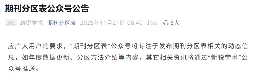 期刊分区表官方公众号曾经发过这么一则消息: