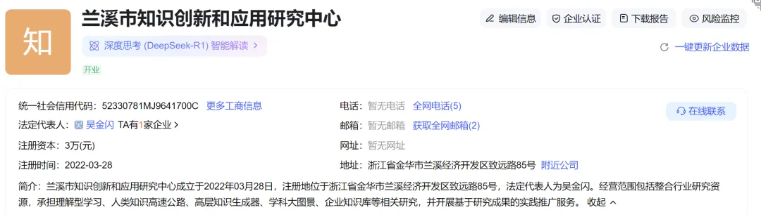 爱企查显示兰溪市知识创新和应用研究中心信息如下: