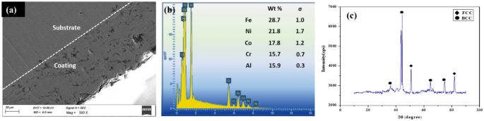 对使用AlCoCrFeNi HEA为原料通过APS方法喷涂的涂层样品的微观结构表征如图3所示。通过SEM在不同放大倍率下对未喷涂的样品表面和涂层表面的飞溅形貌进行了详细的研究。通过观察可得正是由于HEA为均匀的单相固溶体,使其可以均匀的分布在样品表面。这样的均质结构显著增强了HEA涂层与基材之间的结合作用。这分子间的作用力得到增强从而提高了涂层的强度及附着力。且界面间的作用力的能够显著增强材料的各项机械性能,从而使材料应用更加广泛。图3a的涂层表面的SEM图展示了涂层为具有少量孔隙的层状结构。与晶体取向、晶粒边界或其他结构特征相比,层状结构是涂层微观结构的主要结构单元。从整体上看还显示出由于涂层过程中高热能引起的深色和浅色喷溅斑点。这些喷溅斑点是熔融的液滴在快速升温后凝固和分散造成的。图3b所示的涂层表面的EDS映射进一步证实了HEA粉末能够成为一种涂层材料。从图3c展示的涂层表面的XRD图中能够得出其晶体结构转变为以BCC为主要晶型以及FCC相为次要晶型。