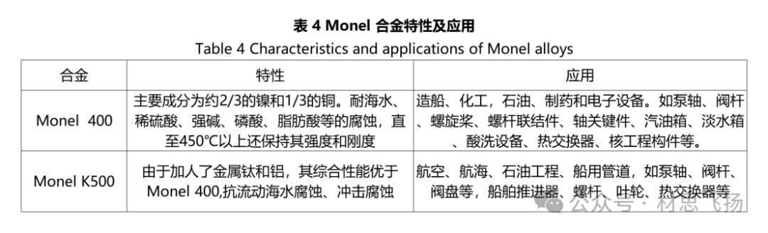镍(Ni)与铜(Cu)能够以任意比例混合形成固溶体合金,此合金被称作蒙乃尔(Monel)合金。镍 - 铜(Ni - Cu)合金具备良好的耐氢氟酸(HF)、海水、盐水以及缝隙腐蚀的性能。蒙乃尔合金Ni70Cu30作为最早出现的镍基耐蚀合金,不仅拥有较高的强度与韧性,还具备优异的抗还原酸、强碱介质以及海水等腐蚀的性能,通常用于制造输送氢氟酸(HF)、盐水、中性介质、碱盐以及还原性酸介质的设备。除应用于上述腐蚀环境外,蒙乃尔合金还可用于苛刻工况下氧气阀门的阀芯(具体可参见GB50030或GB16912,压力管道增补注释)。蒙乃尔合金主要分为铸造合金和变形合金(轧材)两大类。最为常用的蒙乃尔合金为Monel 400和Monel K500,具体情况如表4所示。Monel合金在国外广泛用于耐腐蚀阀门和军舰。英国北海输油管道与泰晤士河大桥的螺栓、螺母采用Monel 400和K500;英国舰艇螺旋桨关键部件由Monel合金制造;法国"戴高乐"航母设备系统使用Monel材料。美国宾夕法尼亚火车站、五角大楼等建筑屋顶也应用此合金。