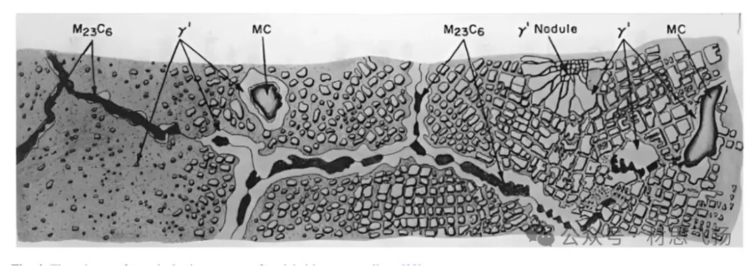 镍基合金的晶体结构主要呈现为在高温环境下具有稳定性的面心立方(FCC)结构。为增强其耐热性能,向其中添加了大量合金元素,这些元素会促使各种二次相形成,进而提升镍基合金的高温强度。二次相的类型涵盖了多种形式的MC、M23C6、M7C3等碳化物,它们主要分布于晶界处;此外,还包括如γ'或γ''等在结构上具有共格性(Coherent)的有序(Ordering)金属间化合物。γ'相和γ''相的化学组成大致为Ni3(Al, Ti) 或Ni3Nb,此类有序相在高温条件下具有高度稳定性,通过对其强化能够获得优异的蠕变破坏强度。典型镍基合金的微观组织如图2所示:
