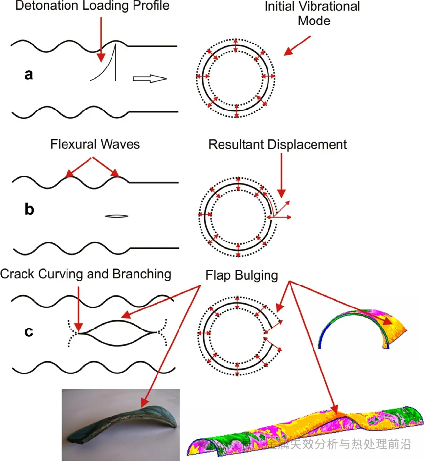 其结果是形成一种波动的周向(环向)应变模式,即使在爆轰载荷消退后仍持续存在。当管材存在轴向贯穿厚度裂纹时,裂纹表面各点可继续发生径向振荡。然而,由于裂纹表面为无牵引状态,这些点亦会在邻近材料施加的应力影响下发生周向位移。