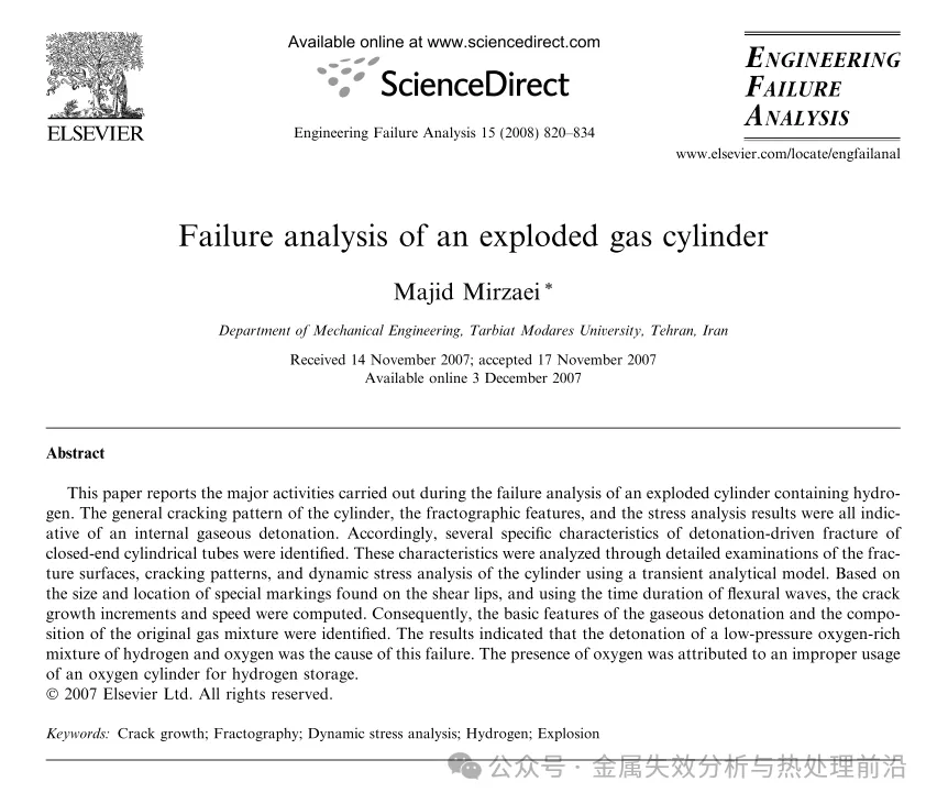 1、本项调查旨在查明一只商用氢气气瓶发生爆炸的原因。气瓶总体裂纹形貌、断口形貌特征及应力分析结果均表明,爆炸系由内部气体爆轰引起。因此,识别出若干封闭端圆柱管在爆轰驱动断裂过程中的特定特征,包括:瓣状鼓胀、鼓胀区域附近裂纹弯曲与分叉、剪切唇上形成的阶梯状条纹,以及瓶帽中心处的多重开裂。研究表明,初始裂纹由局部过大的剪切应力引发,而后续裂纹扩展则几乎完全受结构波控制。