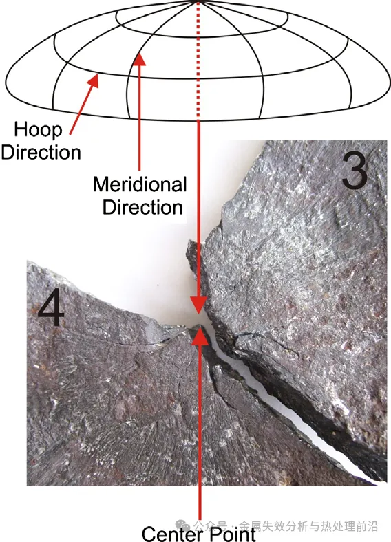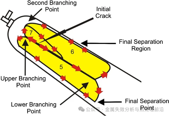 人字形条纹表明,导致封头断裂的两个主要初始裂纹起始点距中心点各向外偏移 10 mm。自这两个起裂点出发,三条裂纹分别朝封头边缘的不同方向扩展,从而使封头被分割为三个碎片;这些碎片仍通过其弯曲边缘与主体气瓶相连。随后,每条径向裂纹发生分叉,并形成两条新的裂纹前沿,分别沿相反方向周向扩展。结果,每个碎片的弯曲边缘从两侧被切断,缩减为一条连接筋。