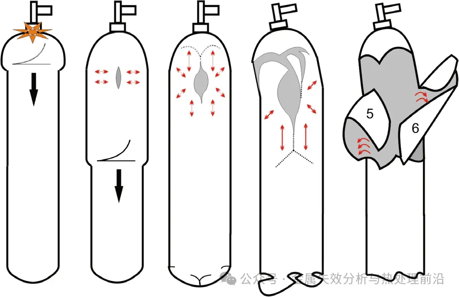 图 12 气瓶变形与断裂的各个阶段。双头箭头表示拉应力,弯曲箭头表示弯曲。