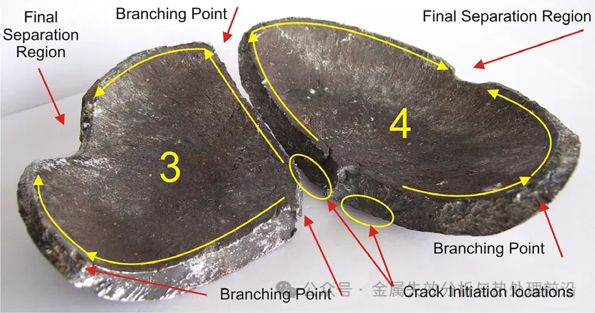 图 8:自裂纹起裂点向外辐射的人字形条纹指向初始半椭圆形裂纹(碎片编号 4)。本图色彩已作调整,以增强裂纹表面特征的对比度。