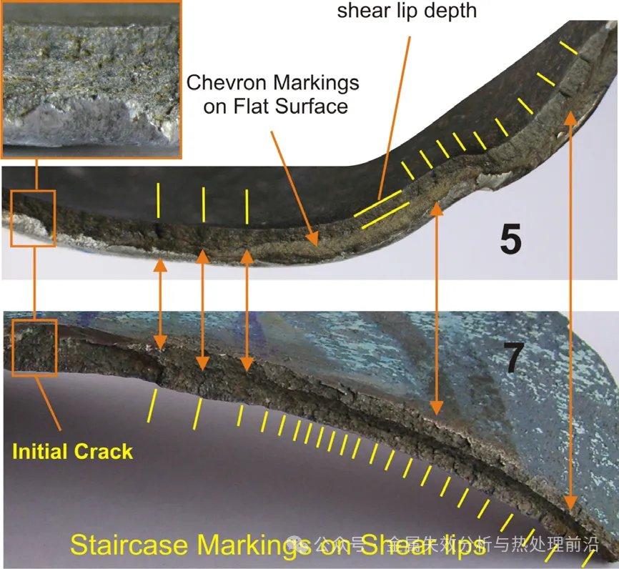 图4. 上部裂纹起始位置及碎片5号与7号共轭断口面上的特殊条纹。