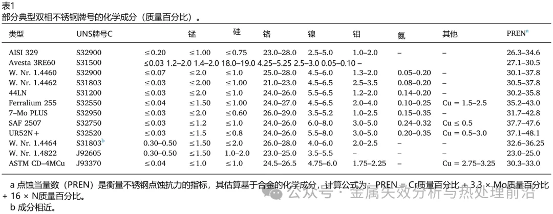 自20世纪70年代以来,双相不锈钢持续发展,已生产出大量具有复杂化学成分的商用合金(见表1),其中含有大量合金元素,如铬、镍、钼、氮、锰、钨和铜。