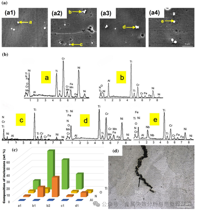 图32 夹杂物成分分析及DDC形貌:a 不同Al和Ti含量样品的夹杂物形貌:a1 Al = 0.14wt%,Ti = 0.30wt%,a2Al = 0.29wt%,Ti = 0.62wt%,a3 Al = 0.42wt%,Ti = 0.92wt%,a4 Al = 0.19wt%,Ti = 0.34wt%,b 夹杂物XEDS分析,c 夹杂物成分数据,d 塑性下降开裂