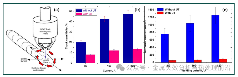 图21 磁搅拌焊接装置及超声处理对裂纹敏感性的影响结果:a GTAW焊枪与磁探针示意图,其中洛伦兹电弧力方向向下,电流流向及探针诱发的环形电弧振荡偏转,b 焊接电流与超声处理对Inconel 718合金裂纹敏感性数值的影响,c 超声振动对Inconel 718合金枝晶臂长的影响。