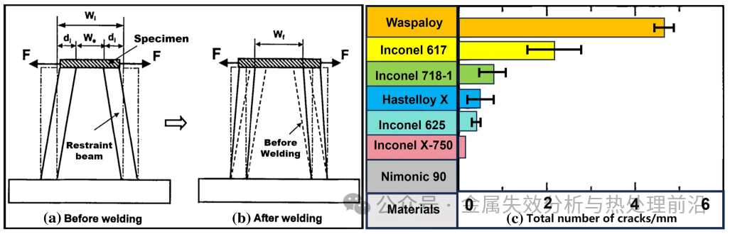 图38 U型热裂纹试验及七种不同镍基高温合金的裂纹敏感性评估:U型热裂纹装置在焊接前a与焊接后的工作原理b、c 各种镍基高温合金的液化裂纹敏感性及液化温度范围