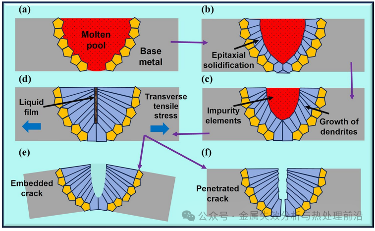 二、3 类核心热裂纹 2.1 凝固裂纹 图11 半固态材料,即部分熔化的母材晶粒及糊状 区,位于合金焊接熔池周围。 图12 焊缝裂纹形成机理:a 熔池开始凝固,b 形 核,c 晶粒长大,d 低熔点液膜形成,e 嵌入式裂 纹,f 贯穿式裂纹。