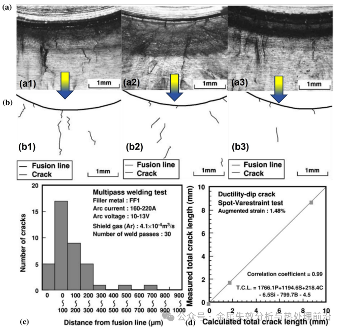 图33 填充金属中不同P和S含量对690镍基高温合金多道焊微裂纹影响的分析:a 690镍基高温合金多道焊缝金属中微裂纹形貌(采用不同S和P含量的填充金属):a1 S = 16wt%,P = 50wt%,a2 S = 37wt%,P = 9wt%,a3 S = 1wt%,P = 20wt%,b 示意图微裂纹示意图:b1 S = 16wt%,P = 50wt%,b2 S = 37wt%,P = 9wt%,b3 S = 1wt%,P = 20wt%,c 采用S和P含量分别为16wt%和50wt%的填充金属进行多道焊所获得焊缝金属中微裂纹萌生位置的直方图,d 总DDC长度与填充金属中痕量及杂质元素含量的回归分析