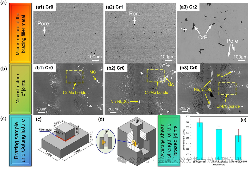 图9 钎料金属微观组织及钎焊试样示意图:a 钎料金属微观组织:a1 Cr0钎料、a2 Cr1钎料、a3 Cr2钎料;b 采用不同钎料焊接的接头:b1 Cr0钎料、b2 Cr1钎料、b3 Cr2钎料;c 钎焊试样;d 剪切试验用夹具;e 钎焊接头平均剪切强度