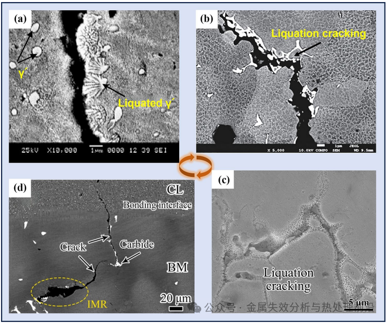 图22 液化裂纹微观形貌:a IN-738 LC合金的液化裂纹[137],b Inconel 718合金的液化裂纹[138],c、d K447A合金的液化裂纹[139, 140]。