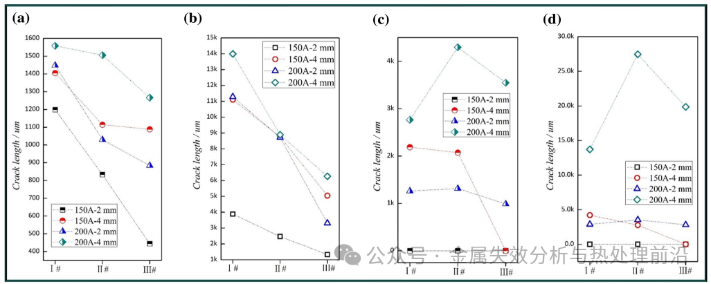 图34 热输入与施加应变对690镍基高温合金焊缝金属热裂纹敏感性的影响:a 最大凝固裂纹长度统计,b总凝固裂纹长度,c 最大DDC长度统计,d 总DDC长度统计