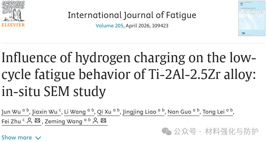 近日一项研究指出,在Ti-2Al-2.5Zr合金低周疲劳行为中,B型δ氢化物不仅对滑移有阻碍作用,而且能够与基体一起发生塑性变形而不发生断裂,填补了该合金氢致疲劳机理的研究空白。相关研究以“Influence of hydrogen charging on the low-cycle fatigue behavior of Ti-2Al-2.5Zr alloy: in-situ SEM study”为题被发表在期刊《International Journal of Fatigue》上。