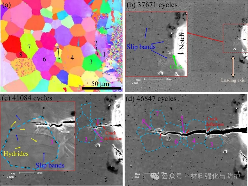 (a) Ti-2Al-2.5Zr合金在疲劳试验前含有295ppm氢的IPF,以及σmax=420MPa时的疲劳裂纹扩展行为,(b) 37,671次循环,(c) 41,084次循环和(d) 46,847次循环