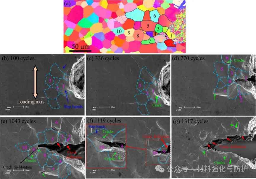 (a) 疲劳试验前Ti-2Al-2.5Zr合金的IPF,以及σmax=505MPa时的疲劳裂纹扩展行为,(b) 100次循环,(c) 336次循环,(d) 770次循环,(e) 1043次循环,(f) 1119次循环和(g) 1317次循环