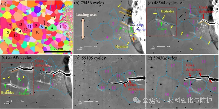 (a) Ti-2Al-2.5Zr合金在疲劳试验前含有500ppm氢的IPF,以及σmax=420MPa下的疲劳裂纹扩展行为,(b) 29,456次循环,(c) 48,564次循环,(d) 53,939次循环,(e) 59,105次循环,以及(f) 59,430次循环