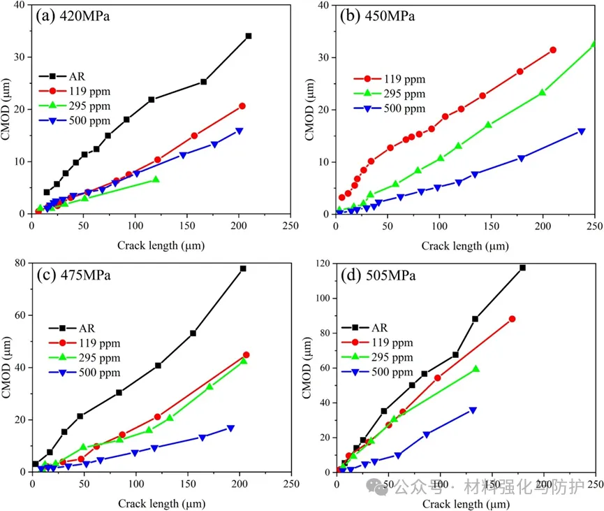 氢含量达500ppm仍保持穿晶裂纹扩展模式,无沿氢化物的快速裂纹扩展。氢化物使裂纹尖端塑性区和裂纹口张开位移显著减小,同时抑制晶间裂纹形成。