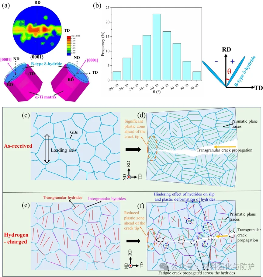 (a) {0001}极图,α-Ti晶格的优选取向和氢化物片层的几何形状;(b) 氢化物片层相对于ND平面上的RD的角度分布;(c, d) as-received和(e, f)氢充电Ti-2Al-2.5Zr合金的疲劳裂纹扩展行为的示意图