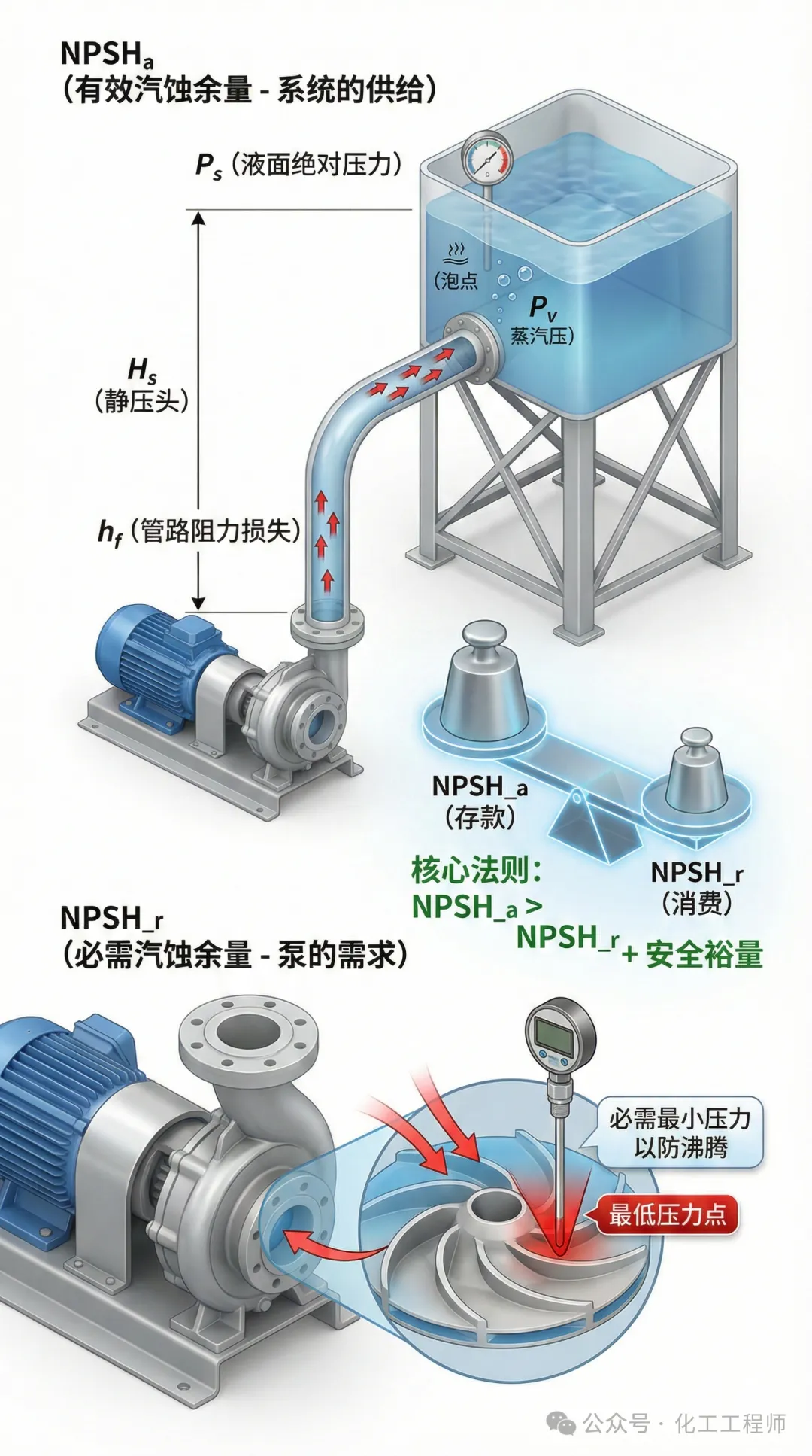在这个战场上,有两位绝对的主角:有效汽蚀余量(NPSHa) 和 必需汽蚀余量(NPSHr)。我们可以把它们理解为一场“供给与需求”的博弈。