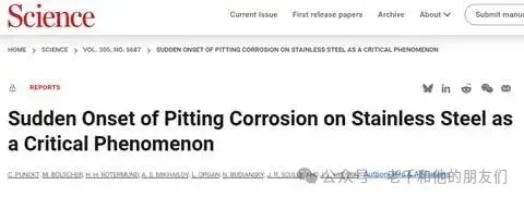 C. Punckt等人的理论分析还表明,这个规律可能不是不锈钢独有的,而是所有金属发生点蚀的普遍特征;当然,这并不排除单个点蚀坑会在后续的过程中慢慢稳定下来。