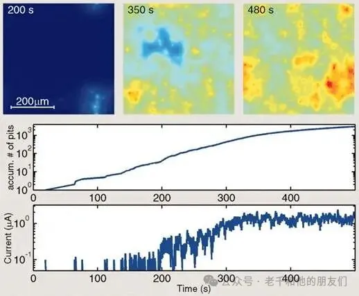 这圈光晕的形成原因C. Punckt等人也做了分析,大概率是活性点蚀坑周围的离子浓度不一样,形成了半球形的浓度梯度,这个梯度就像一个微型放大镜,把金属表面照得更亮了。当电流降到背景的噪声水平,说明点蚀坑又停止腐蚀了,这时光晕还会持续 0.6 秒,这个时间和离子从点蚀坑扩散到周围溶液的时间基本一致,等这些离子扩散完,光晕就会消失。另外,点蚀坑再激活后,原来的位置会一直留着这个小黑点,同一个黑点还可能被反复激活,多次发生腐蚀。