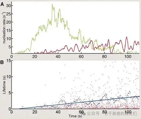 高活性点蚀坑的寿命规律:图 3B 是高活性点蚀坑的寿命 —— 也就是它持续腐蚀的时间 —— 和它开始腐蚀的时间之间的关系。C. Punckt等人通过计算机处理视频数据,统计了所有高活性点蚀坑(图 2 中红色星标)的寿命,发现一个规律:虽然这些点蚀坑都是还没稳定的亚稳态坑,但它们的腐蚀持续时间,会随着实验的进行慢慢变长。