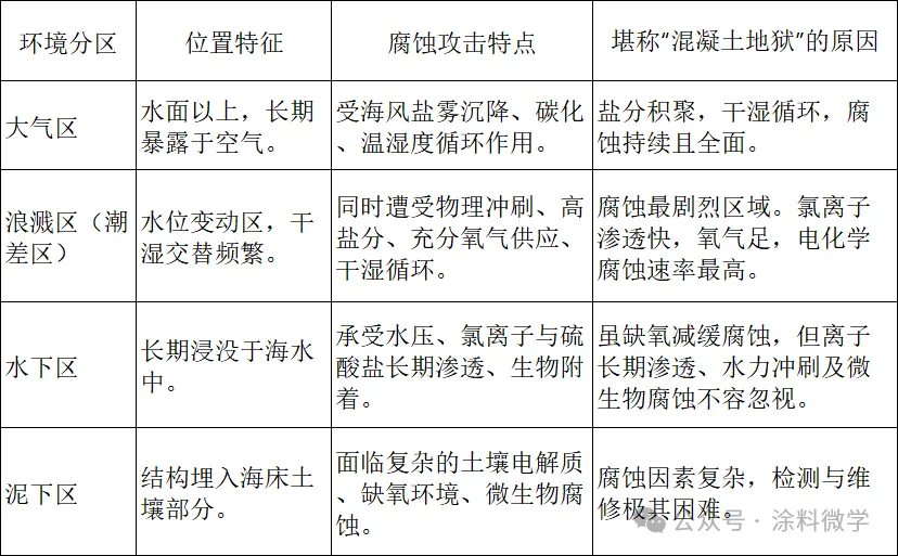 以腐蚀最严酷的海洋环境为例,一个典型的混凝土结构自上而下会经历四个截然不同的“战场”: