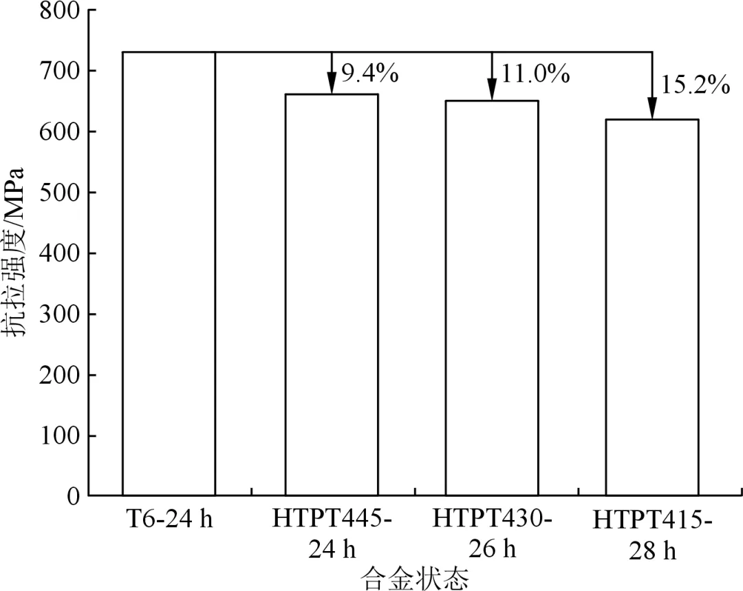 图1 AlZnMgCu合金随炉升温过程温度和电导率的拟合曲线 图2 高温预时效处理工艺时效时间-硬度曲线 图3 不同状态下合金的抗拉强度 图4 T6和HTPT处理后合金的剥落腐蚀横截面照片
