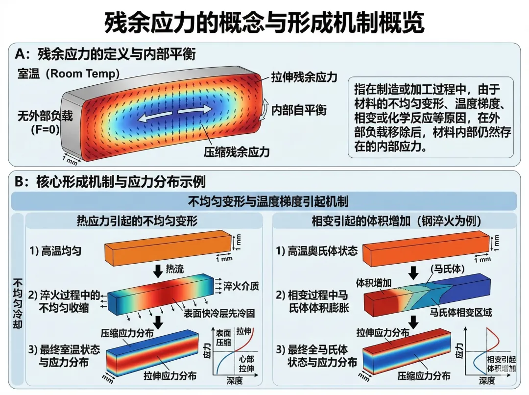 从热力学角度理解,残余应力代表了材料内部储存的一种弹性能。当材料经历不均匀的塑性变形或相变时,不同区域之间的变形不协调导致内部应力的产生。