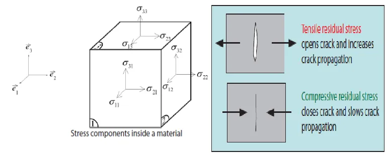 材料内部应力分量的表示方法,以及残余应力(拉应力 vs 压应力)对裂纹扩展的影响